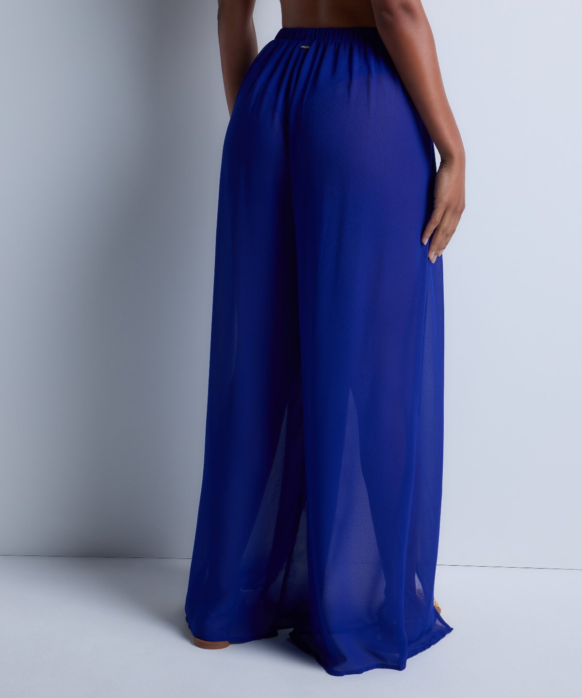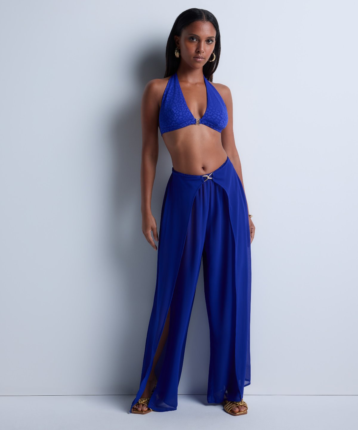 Jouant avec la légèreté de son voile sensuellement transparent, le pantalon Beach Walk offre une forme fluide et sexy, ornée de fentes qui dévoilent subtilement la jambe à chaque mouvement. À la taille, un effet drapé retenu par une double boucle dorée souligne les courbes féminines pour une silhouette élégante.