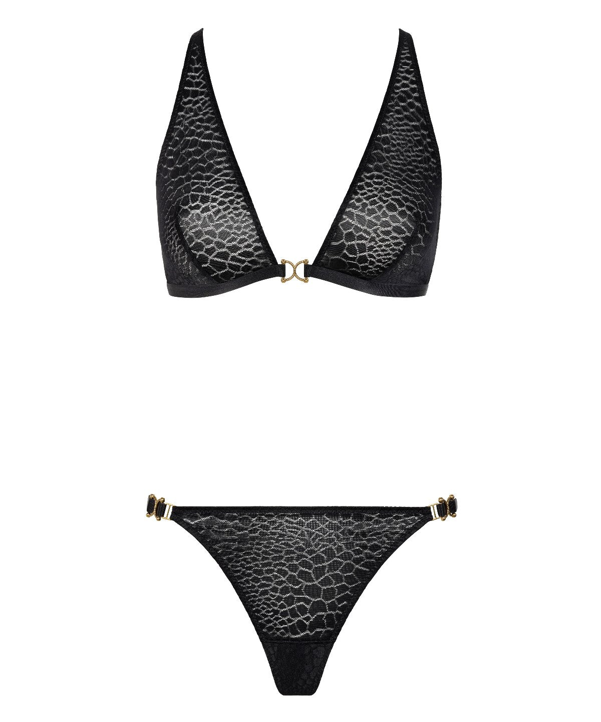 Suggestive et raffinée, la collection Boîtes à Désir d’Aubade révèle toute la puissance de la séduction. Le set «Depths of the Night», composé d’un soutien-gorge triangle sans armature et d’un string, sublime votre silhouette avec une dentelle délicate et un tulle transparent qui habille et dévoile subtilement la peau. Les détails graphiques raffinés mettent en valeur le décolleté et le dos, créant un équilibre parfait entre sensualité et élégance. Ce modèle ajustable en taille unique est une invitation à laisser libre cours à vos fantasmes tout en s’adaptant parfaitement à votre corps.