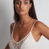 - Le confort et la douceur incomparable de la maille composée d’un mélange de modal et de soie, associée à la légèreté d’une laize dentelle florale tout en transparence