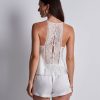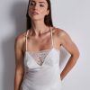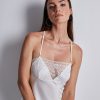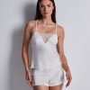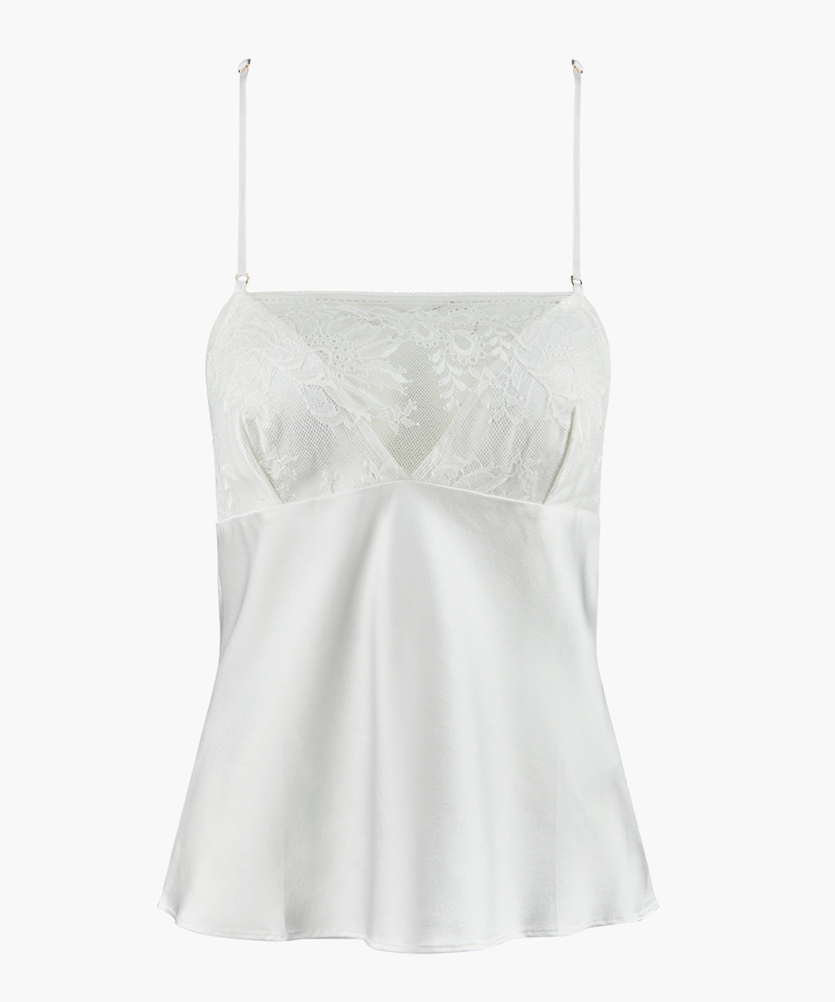 Fluide, le top fines bretelles Midnight Whisper déploie sur le buste une soie sexy et confortable. Créant des effets de contraste entre transparence et opacité très sensuels, un empiècement en dentelle élégante vient se déposer sur le décolleté et se poursuit dans le dos dans une forme graphique très originale.