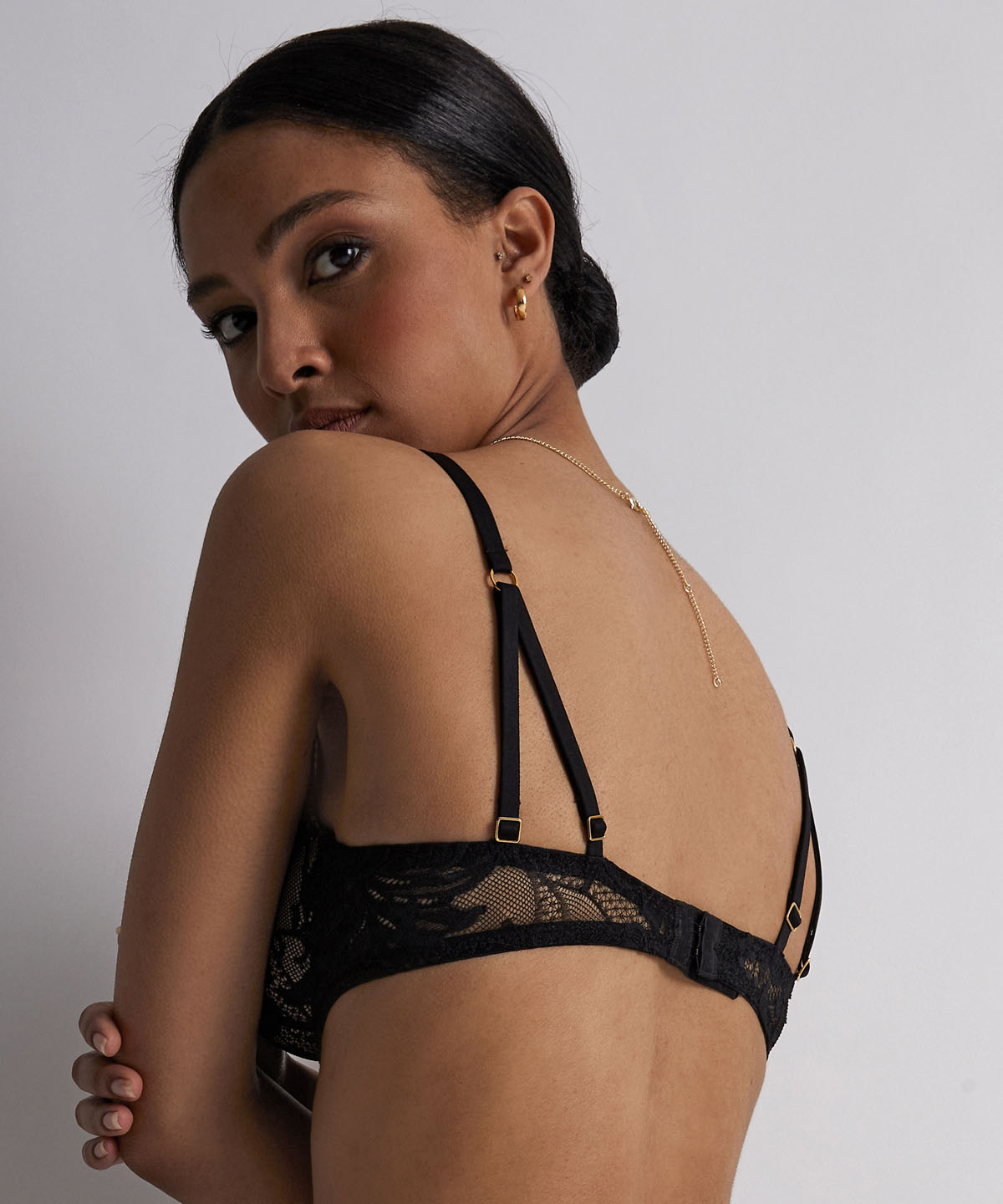 Avec sa dentelle remontant haut sur la poitrine, le soutien-gorge plunge foulard Gold Pleasure en souligne le galbe et confère au décolleté un effet push-up très sexy, sublimé par une chaînette façon sautoir. Derrière, les doubles bretelles offrent maintien et confort, tout en apportant un style résolument moderne à l’ensemble.