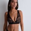 Sans armatures, le soutien-gorge triangle bralette Into The Groove offre une forme confortable, souple et légère, au décolleté vertigineux. Déployant jusqu’à l’épaule sa broderie végétale sexy, réhaussée par une basque graphique résolument moderne sous la poitrine pour un maintien renforcé, il se pare sensuellement de jeux de transparence irrésistibles.