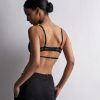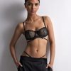 - Véritable signature de la ligne, un motif de liens croisés pare les basques des soutiens-gorge en revisitant les codes du bondage