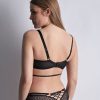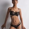 Alliant confort et séduction jusqu’au bonnet G, le soutien-gorge corbeille armatures L’Indomptable se pare d’une broderie graphique exclusive, encadrée par une résille transparente délicate. Structurant un décolleté ouvert et sexy, la naissance des bretelles se scinde en trois liens en écho au motif croisé façon bondage qui souligne la poitrine.