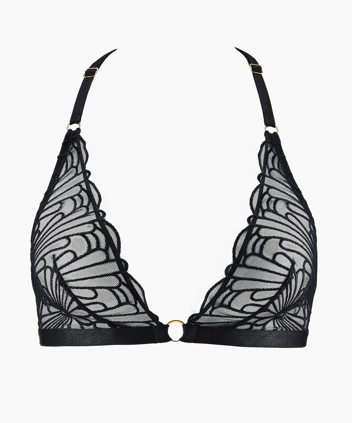 Léger et mode, le soutien-gorge triangle L’Indomptable, sans armatures, offre un décolleté profond, structuré par une broderie graphique exclusive et par des anneaux dorés à l’entregorge et sur les bretelles. Dans le dos, il se pare d’un jeu sculptural de bandes croisées esprit bondage pour un effet résolument hypnotique.