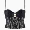 - Un magnifique bustier complète la ligne, avec ses bonnets doublés en tissu opaque. Cette pièce exceptionnelle se porte aussi bien en pièce de lingerie qu’en pièce d’extérieur. Une forme ultramode !