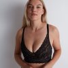 Sans armatures, le soutien-gorge triangle brassière confort Rosessencedéploie une dentelle florale élégante de l’épaule à la taille dans une forme bustier moderne qui assure un maintien optimal. Sexy, il offre un dos largement ouvert et un décolleté profond, souligné à l’entregorge par un bijou doré avec strass élégant.