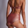 Offrant une coupe moderne, confortable et couvrante, la culotte haute Sunlight Glow n’en est pas moins résolument sexy. Entièrement en matière métallisée lumineuse, sa forme légèrement échancrée met sensuellement en valeur les hanches et le galbe des fesses. Dans le dos, une plaque dorée illumine subtilement le creux des reins.